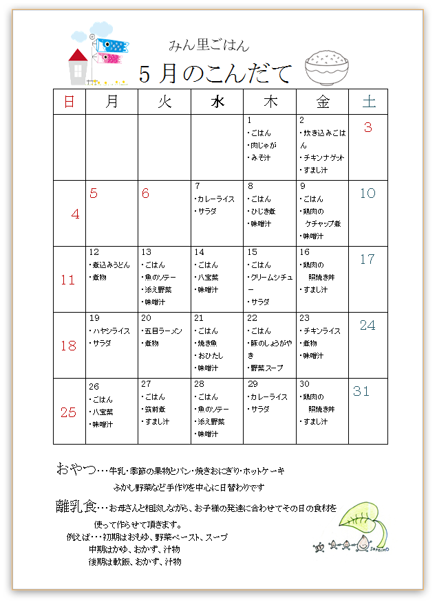 ※土・日・祝は給食がありません。お弁当をお願いします。 | |